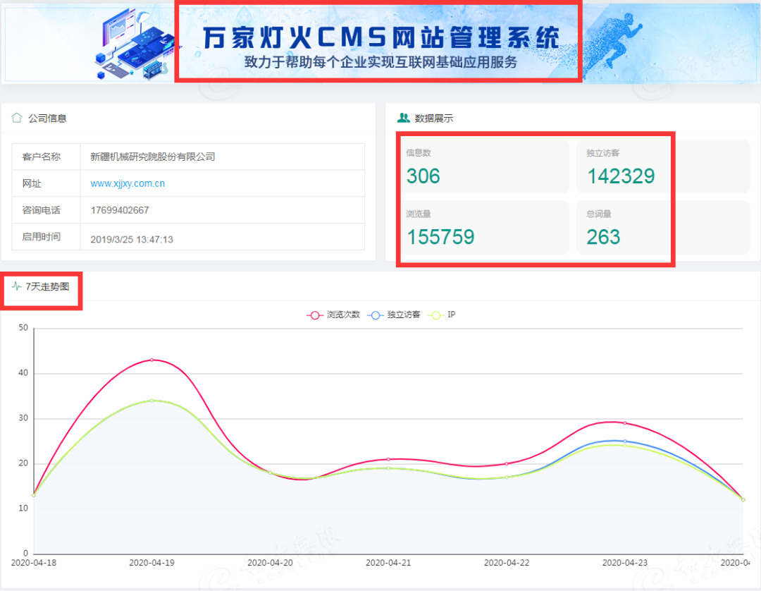 此次“萬家燈火CMS系統(tǒng)”的升級版,1. 在原有的基礎上,增加網站關鍵詞7天走勢圖以及網站關鍵詞在各大主流搜素引擎占比餅狀圖,將數據更加精細化,*化。