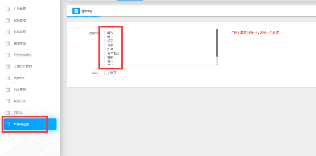 廣告法規(guī)定越來越嚴格,廣告詞成了企業(yè)的不敢碰觸的“炸彈”。對此,此次“萬家燈火CMS系統(tǒng)”的升級,可在編輯框中自定義自己領域中的違禁詞,讓網站遠離“危險”*。