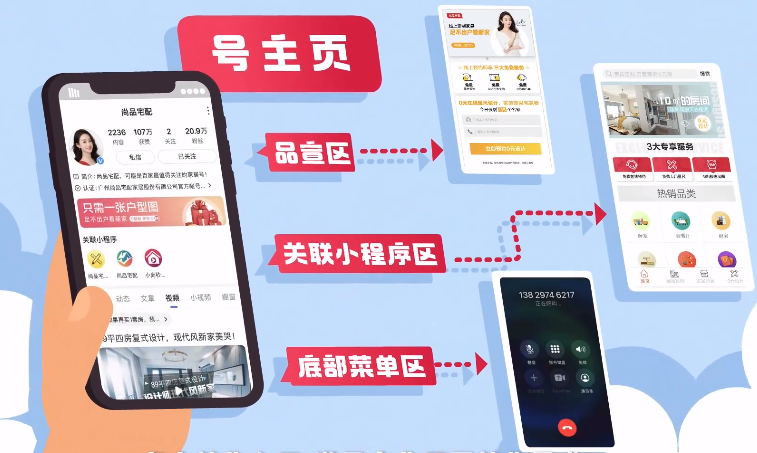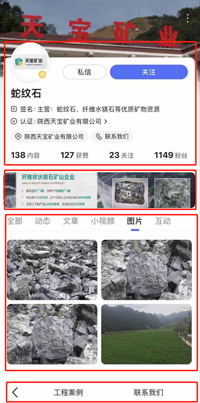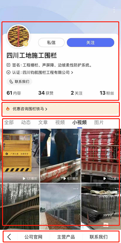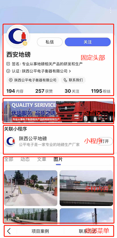 企業(yè)百家號主頁分5大模塊:固定頭部、品宣區(qū)、小程序、多樣內容、底部菜單。