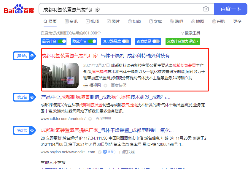 投放1條視頻,百度效果次數(shù)6條,成都?xì)錃馓峒兗夹g(shù)、成都?xì)錃馓峒儭⒊啥細(xì)怏w干燥劑等詞均已在百度展現(xiàn),讓潛在客戶能輕松實(shí)現(xiàn)對(duì)企業(yè)核心競(jìng)爭(zhēng)優(yōu)勢(shì)的*了解。