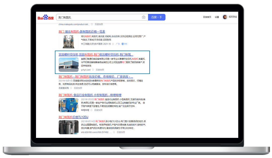 匯雅通官網(wǎng)上線不到1個(gè)月,成功被搜索引擎收錄,而且關(guān)鍵詞:荊門制氮機(jī)、宜昌螺桿空壓機(jī)、宜昌干燥機(jī),均在百度首頁(yè)展示。