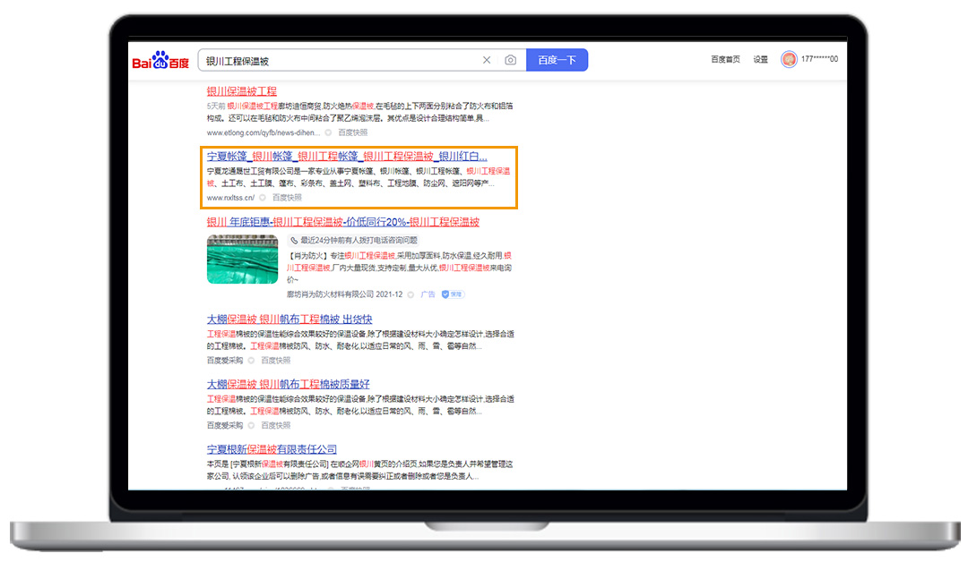 龍通晟世網(wǎng)站上線20天左右,就成功被搜索引擎收錄,而且關(guān)鍵詞:銀川工程帳篷、銀川工程保溫被、銀川紅白喜事帳篷等,均在百度首頁展示。